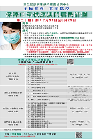 第二十輪計劃的售賣點及時間與第十九輪相同。而計劃的對象為本澳永久及非永久居民、持外地僱員身份認別證(俗稱藍咭)人士;衛生局轄下衛生中心及衛生站、衛生局協議藥房、本澳三個社團(工聯、街總、婦聯)繼續提供售賣口罩服務,即全澳共有八十四個售賣點,詳情見附圖。