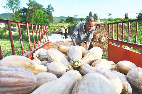 近日,貴州省銅仁市思南縣許家壩鎮雙壩壩區種植的南瓜、冬瓜陸續成熟,農民忙著採收、搬運、銷售,田間地頭一派忙碌的豐收景象。近年來,思南縣積極推進十九個五百畝以上壩區建設,採取「龍頭企業+合作社+農戶」的發展模式,發展蔬菜、紅薯、精品水果、中藥材等壩區產業,幫助農民就近就業增收。◇ (新華社)