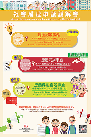 房屋局呼籲,社屋申請並非先到先得。有意申請應透過社屋申請專題網頁(www.ihm.gov.mo/zh/ahsp),了解申請內容,準備好附同文件,毋需急於申請。因應防疫工作,在遞交申請表時,請佩戴口罩、配合現場測溫及出示個人健康聲明憑證。