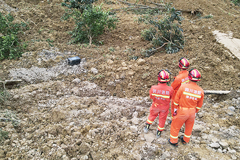 受連續強降雨影響,二十一日三時五十分左右,四川省雅安市漢源縣富泉鎮中海村六組境內突發地災滑坡。原本覆蓋著綠色植被的山體表面赫然露出一塊斜長約八百八十米、寬約二百八十米的泥黃色破壞面。