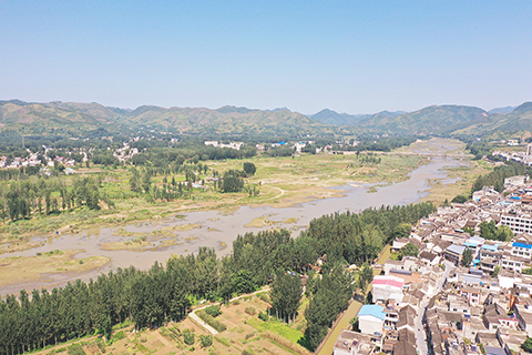 ◎ 這是本月廿五日拍攝的河南省南陽市淅川縣荊紫關古街及丹江(無人機照片)。(新華社記者馮大鵬 攝)