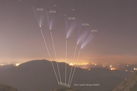 太陽進行視運動的黃道面,也是所有行星繞太陽公轉的軌道面。這幅由五張照片精心合成的主題影像,精確的記錄這顆彗星每晚的位置,以及在攝於西班牙.巴塞隆納北邊的圖羅德霍姆山之前景照片上,外插出的五個太陽位置。如今踏上返回太陽系外圍旅程的NEOWISE彗星,不再是上個月那個肉眼可見的精彩天體,但仍然是小望遠鏡可見。(影像提供與授權:Ignacio Llorens)