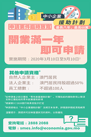 有需要申請「中小企業援助計劃」或「調整還款」措施的中小企業,可瀏覽經濟局網頁(www.economia.gov.mo)瞭解詳情並及早提出申請。