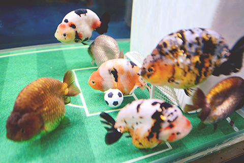 ◎ 九月四日,第七屆中國(福州)金魚文化節在福建省福州海峽國際會展中心開幕,黑皇冠珍珠、五花琉金、望天球、紅獅頭、紅白蝶尾以及福壽系列的紫白蘭壽、紅白蘭壽等數十種金魚在此展出。圖為金魚在「足球場」魚缸內「踢」足球。(中新社記者 王東明 攝)