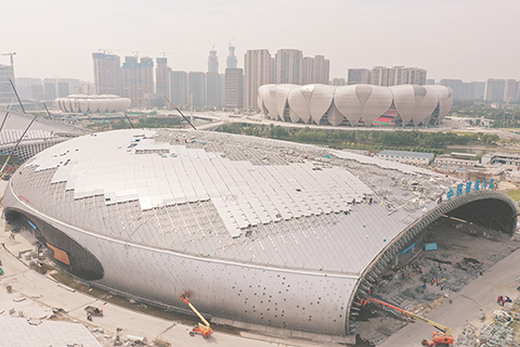 ◎ 這是九月九日拍攝的建設中的杭州奧體中心游泳館(無人機拍攝)。日前,作為杭州亞運會的標誌性建築之一,外觀酷似蝴蝶的杭州奧體中心主體育館、游泳館項目通過主體結構工程驗收,項目建設進入機電設備安裝、室內精裝修及室外市政配套建設階段,預計今年底竣工。(新華社記者 黃宗治 攝)