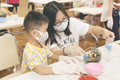 其後的微景觀工作坊中,由親子利用沙子、植物及模型等工具,共同創作盆景,享受製作手工作品帶來的喜悅和成就感,讓孩子建立自信及創造力;同時,在遊戲過程加強親子溝通合作,促進彼此間互相交流及支持,從而了解家庭成員的不同特點,認識情緒。