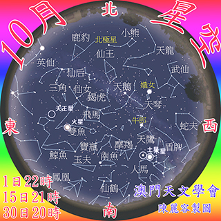 水星東大距:10月2日0點,日距角25.8度,視亮度0.0等。火星衝:10月14日7點,視亮度-2.6等。水星留:10月14日。水星內合:10月26日2點。天王星衝:10月31日23點,視亮度5.7等。◇ (建燁)