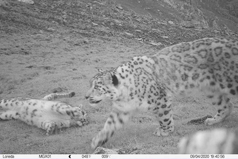 雪豹,位於高山生態系統食物鏈頂端,因其常在亞洲腹地的高山雪線附近活動,善於攀岩,行蹤隱秘,被譽為「雪山之王」。據連新明團隊提供的視頻畫面顯示,一隻大雪豹帶著一隻小雪豹在鏡頭前「秀親昵」,看上去長得渾圓渾圓,是一對母子在玩耍。