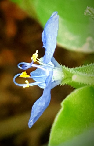 鴨跖草葉形為披針形至卵狀披針形,葉序為互生,莖為匍匐莖,花朵為聚花序,頂生或腋生,雌雄同株,花瓣上面兩瓣為藍色,下面一瓣為白色,花苞呈佛焰苞狀,綠色,雄蕊有六枚。