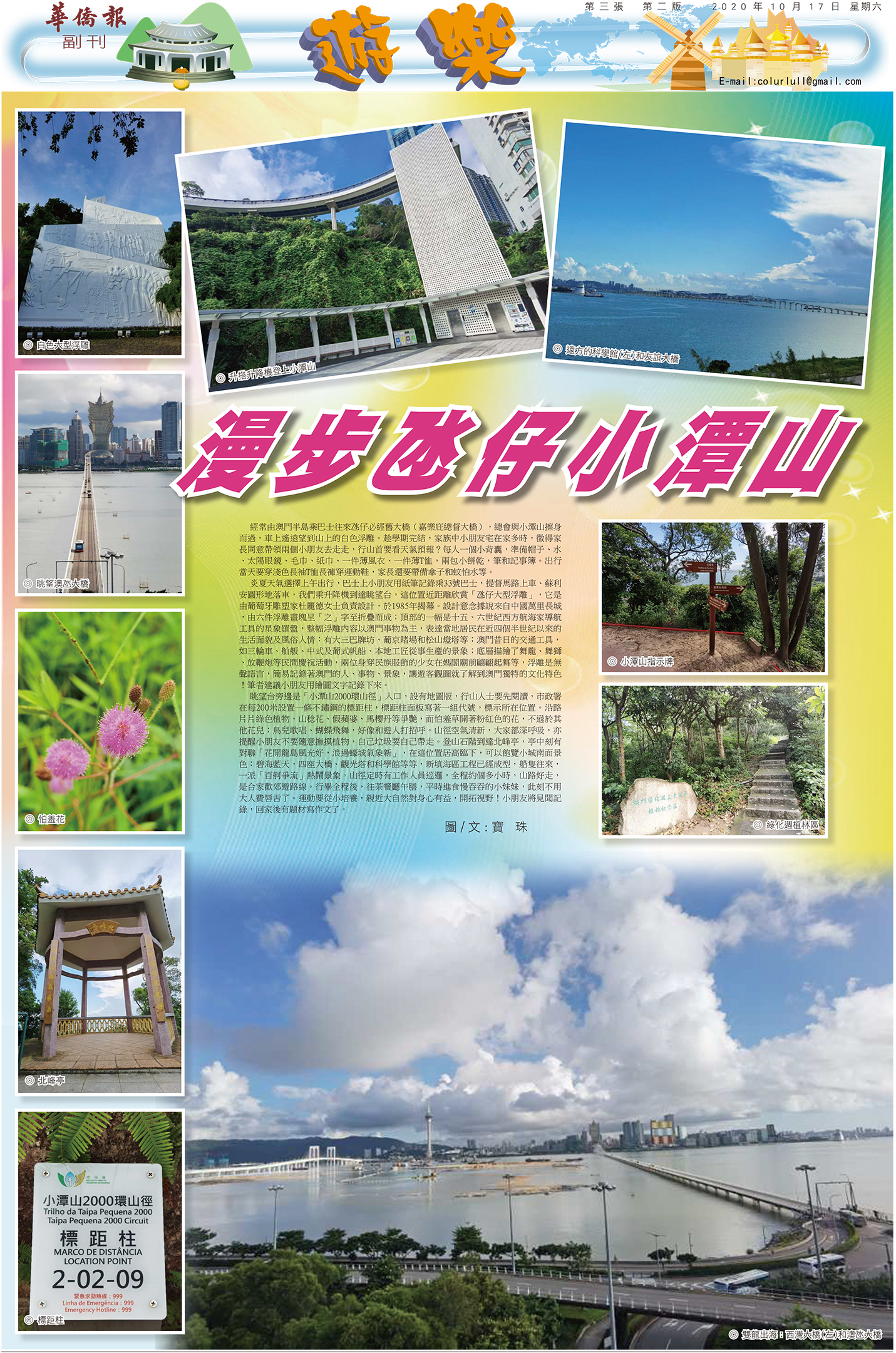 眺望台旁邊是「小潭山2000環山徑」入口,設有地圖版,行山人士要先閱讀,市政署在每200米設置一條不鏽鋼的標距柱,標距柱面板寫著一組代號,標示所在位置。沿路片片綠色植物,山稔花、假蘋婆、馬櫻丹等爭艷,而怕羞草開著粉紅色的花,不遜於其他花兒;鳥兒歌唱、蝴蝶飛舞,好像和遊人打招呼。山徑空氣清新,大家都深呼吸,亦提醒小朋友不要隨意撫摸植物,自己垃圾要自己帶走。登山石階到達北峰亭,亭中刻有對聯「花開龍島風光好,浪過蠔城氣象新」,在這位置居高臨下,可以飽覽小城南面景色:碧海藍天,四座大橋、觀光塔和科學館等等,新填海區工程已經成型,船隻往來,一派「百舸爭流」熱鬧景象。山徑定時有工作人員巡邏,全程約個多小時,山路好走,是合家歡郊遊路線。行畢全程後,往茶餐廳午膳,平時進食慢吞吞的小妹妹,此刻不用大人費唇舌了。運動要從小培養,親近大自然對身心有益,開拓視野!小朋友將見聞記錄,回家後有題材寫作文了。◇ 圖/文:寶 珠