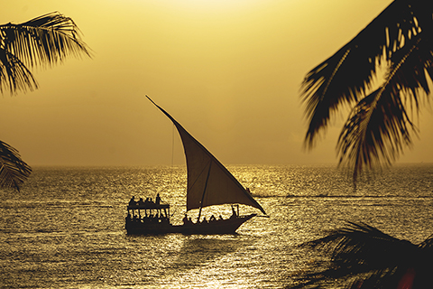 ◎ 這是二0一九年八月二日拍攝的坦桑尼亞桑吉巴爾島暮色中的帆船。(新華社記者 謝晗 攝)