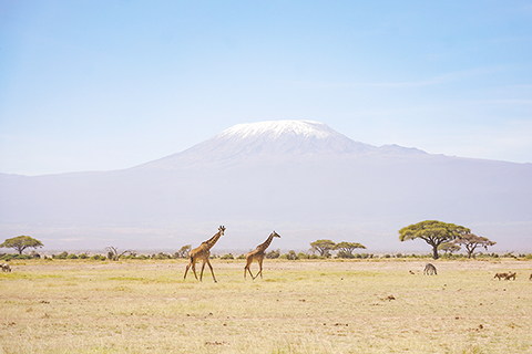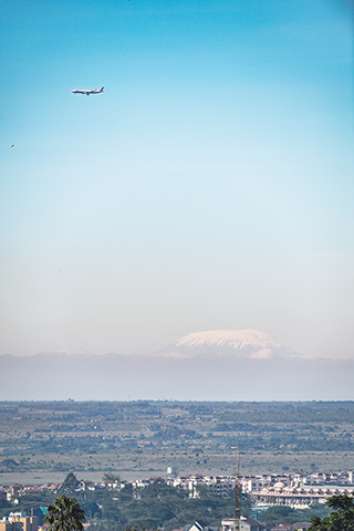 ◎ 二0二0年五月三十日,一架飛機從肯尼亞內羅畢上空飛過,遠處是乞力馬扎羅山。(新華社記者 李琰 攝)