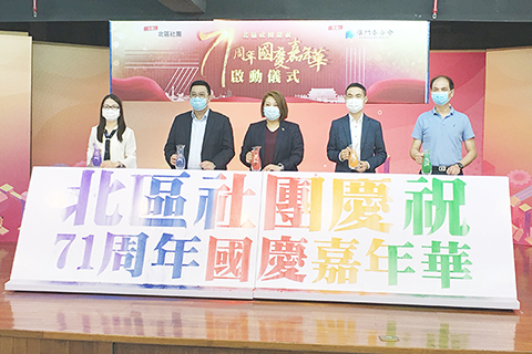 【專訪】北區社團慶祝七十一周年國慶嘉年華啟動儀昨午在工聯北區綜合服務中心舉行,由澳門工會聯合總會副理事長趙蘭瑛、姚嘉聰、民眾建澳聯盟理事長李良汪、澳門婦女聯合總會副理事長庄玲玲及菜農合群社會長江曉瑜為活動擔任主禮嘉賓。