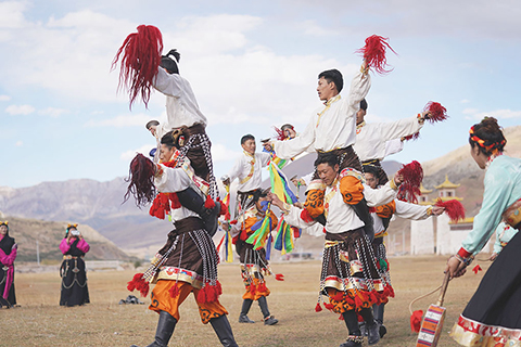 ◎ 十月十七日,「同飲一江水,共話瀾湄情」二0二0瀾湄萬里行中外媒體採訪活動來到青海省囊謙縣,在草原上欣賞富有囊謙特色的「熱巴舞」「弦子舞」及「卓根瑪」。圖為演員表演囊謙「熱巴舞」。熱巴舞,集歌舞、雜技、氣功於一體,在藏區歌舞中自成一體,流行於青海、西藏、雲南、四川、甘肅藏族聚集區,是一種由鼓鈸(單鈸),鑼伴奏的集體歌舞,技巧性強,初時舞姿輕捷,高潮時感情奔放,動作粗獷有力。(中新社)