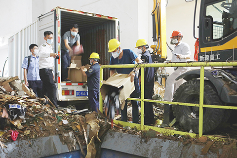 【記者陳藝珠海報道】昨天,拱北海關集中銷毀一批涉案酒類。當日上午,珠海市信環環保有限公司的垃圾處理區內機聲隆隆。在拱北海關執法人員監督下,工人們將一批帶包裝涉案酒類投入大型破碎機裡,一瓶瓶酒被巨大的齒輪絞碎,瞬間變成渣,不時傳出劈裡啪啦的聲響。隨後,這些碎渣和酒液經專業設備無害化處理。