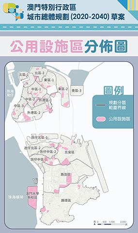 為此,《澳門特別行政區城市總體規劃(二0二0-二0四0)》草案提出優化本澳的公用設施佈局,劃定用於建設提供全澳性且獨立佔地的公用設施區,除維持現時尤其集中於北安區、路氹區及澳門大學新校區的公用設施區外,於北區-1、東區-2、外港區-2、氹仔北區-1及路環區增設公用設施區;至於社區性的公用設施,則主要考慮當區的人口數量及實際服務需要,將根據總體規劃提出的指導性要求,參考各權限部門的相關標準,於詳細規劃階段作具體設置。