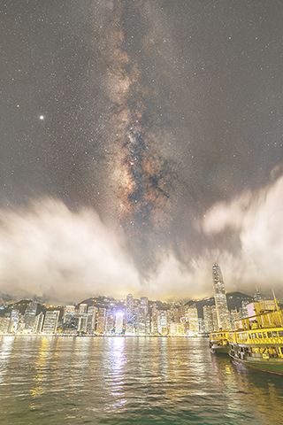 拍攝上其實最講求的是耐性,因為經常都有雲飄過,要等沒雲或小雲的時候作一系列的曝光拍攝,也不是每次也能成功。當明白地景是拆除了光害濾鏡作不同的曝光拍攝,然後再整合到背景的銀河之上,有點像HDR的原理之後,就完成了帶點奇幻味道的維港銀河照片了。◇