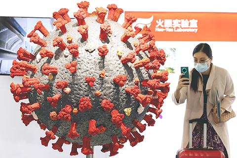 ◎ 十一月十一日,第二屆世界大健康博覽會在武漢國際博覽中心開幕。圖為一位參觀者拍攝新冠病毒模型。(中新社)
