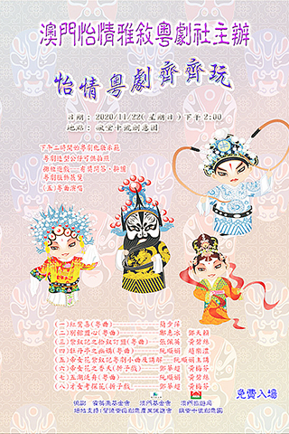 澳門怡情雅敘粵劇社於二0二0年十一月二十二日(星期日)下午二時至五時假瘋堂十號創意園,《怡情粵劇齊齊玩》,內容多元,適合不同年齡的人士參與,增加對粵劇的認識。現場設有化妝示範,粵劇服飾展覽,戲曲油畫展覽,粵劇造型紙板公仔拍照。