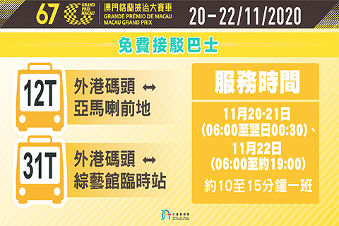 有關具體臨時交通安排和巴士調整安排,可瀏覽局方網頁(http://www.dsat.gov.mo/dsat/events_detail.aspx?a_id=41FD289DE8929F96C6F9CA1925B07A9A#)。
