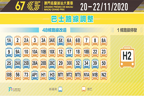 【特訊】因應大賽車關係,明日(周三)至二十二日(周日)賽道周邊路段實施多項臨時交通管制措施,鄰近外港碼頭的栢樂停車場維持封閉至本月二十七日(周五)。本月二十日(周五)至二十二日(周日),增設12T及31T巴士路線免費往返外港碼頭至亞馬喇前地及綜藝館、全日暫停H2路線,而每日首班車起至賽道解封時段內,共四十八條巴士路線改道。