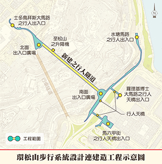 環松山步行系統建造工程完成後,將貫通松山、連接高士德大馬路一帶與新口岸區周邊的步行系統,以及完善區內步行環境、串連周邊公共設施和休閒空間,配合特區政府陸路整體交通運輸政策。◇