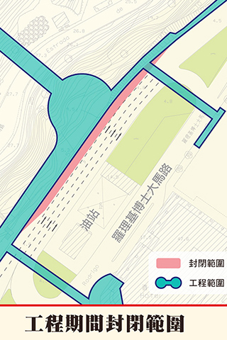 行人隧道施工主要由南向北推進,施工首階段將於短期內開展,北端洞口位置將進行前期工程,拆卸現時二龍喉公園環境資訊中心及平整場地。隧道南洞口羅理基博士大馬路側山坡將進行平整及加固,以便機械進場鑽挖;施工期間,因應工程進度將封閉範圍內馬路近山側一條長約八十米的行車線(油站對面),相關路段仍保留三線行車。