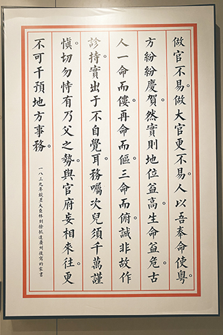 邁進大門是小庭院(有點像大的天井),左右兩側是長長的門廊、大廳立有林則徐銅像(據說習近平當年担任福州市委書記時由他揭幕),銅像左右兩側分別是毛主席與習主席的留言。展覽區詳細地講述了林家情況、林則徐的成長與經歷;身為教書先生的林父年少家貧,直到十三歲才入私塾學習,由於比同學年長常被嘲笑;為此林則徐四歲起,林父就將他帶回私塾旁聽學習、沒想到十歲就能寫出「海到無涯天作岸,山登絕頂我為峰」的驚人詩句。林則徐的善良、正直、淡泊、仁愛等優良品德離不開父母的言傳身教與各位老師的教導。據說當年林母離世,林則徐按傳統禮制回鄉守孝三年,期間江蘇大水朝廷緊急調派、其猶豫;林父道:你為何回來丁憂?是為報答父母養育之恩,我們養育你是希望你能夠報答國家,現在國家需要你,你必須挺身而出。林則徐次日前往江蘇治水。