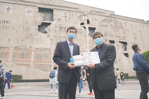 參觀結束後,團員在紀念館外佈滿彈孔的遺址牆前合影,徐莽和馬幼炯分別代表雙方互贈禮品,徐莽表示,希望馬館長有機會到訪澳門,將八百壯士的故事講述給廣大澳門民眾。