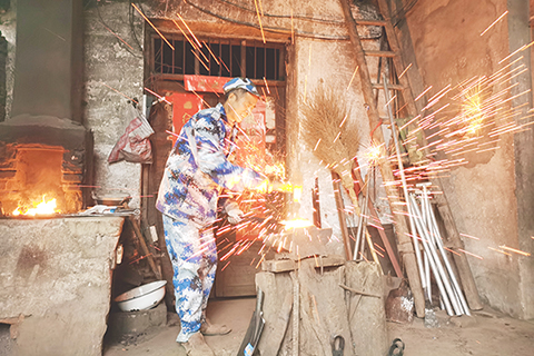 ◎ 十一月二十五日,在安徽省肥西縣銘傳鄉聚星社區,陸玉寶在自家的打鐵舖鍛造農具。陸玉寶從事打鐵工作已有三十多年,他打製的鋤頭、刀具,不僅美觀而且經久耐用。在現代工業浪潮的衝擊下,打鐵這個傳承了千年的古老行當,逐漸被世人遺忘。據陸玉寶介紹,上世紀九十年代,打鐵還是個熱門行當,一條街上就有六家打鐵舖,如今,整個銘傳鄉只有他一家打鐵舖。(中新社記者 張強 攝)