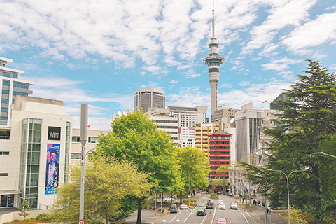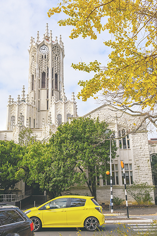 ◎ 在新西蘭最大城市奧克蘭市中心,一輛汽車經過標誌性的奧克蘭大學鐘樓(二0一八年六月廿三日攝)。