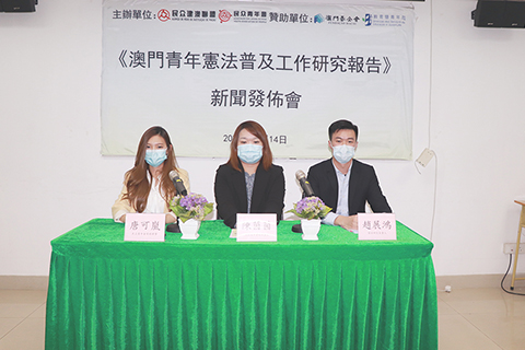 《澳門青年憲法普及工作研究報告》新聞發佈會昨下午四時假民眾建澳聯盟會議室舉行,項目負責人趙展鴻及民建聯青年會代表唐可嵐、陳茵茵等出席。