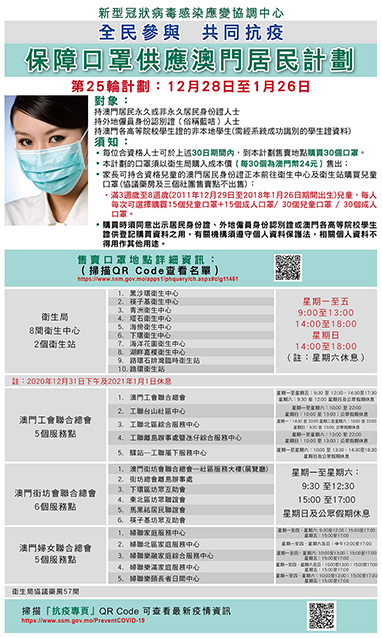 【特訊】新型冠狀病毒感染應變協調中心昨日公佈,第廿五輪保障口罩供應澳門居民計劃於下周一(廿八日)開始,售賣期間為三十日,即二0二0年十二月廿八日至二0二一年一月廿六日,期間每人可一次性購買三十個口罩,售價合共廿四澳門元。對象包括本澳永久及非永久居民、持外地僱員身份認別證(俗稱藍咭)人士,以及持澳門各高等院校學生證的非本地學生,學生在購買口罩時須出示所就讀高等院校的學生證,經系統成功識別學生證資料後方能購買。