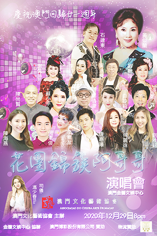 由澳門文化藝術協會主辦,金碧文碧文娛中心協辦,澳門博彩股份有限公司贊助「花團錦簇阿哥哥演唱會」,將於今天十二日二十九日(星期二)晚上八點正,假金碧文娛中心隆重舉行,演出歌手包括黃似蘭,石建東,李玲玉,白蔓莉,蘇小平,鄭森,李素潔,吳泳鋒,謝佩詩,陳尚賢,劉艷萍,李玲玉,唐嘉曦,陳海燕,鄭倩濠,何東俊,劉雅莉,整個音樂會演繹上世紀三十年代至六十年代經典樂曲,包括有我的祖國,夜來香,夜上海,四季歌,把根留住,南屏晚鐘,禪院鐘聲,魂縈舊夢,鄉戀,教我如何不想她,人間第一情,何日君再來,敖包相會,草原之夜,呼倫貝爾大草原等。
