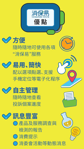 消費者亦可利用「消保易」查詢與消費事務有關的問題,以及對消委會人員、程序手續及電子服務各方面的服務提出意見或建議。