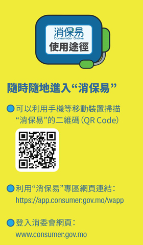 消費者只需利用手機等移動裝置掃描「消保易」的二維碼(QRCode)或透過網頁連結(https://app.consumer.gov.mo/wapp)就可隨時隨地使用「消保易」的投訴、個案進度查詢及諮詢等服務。