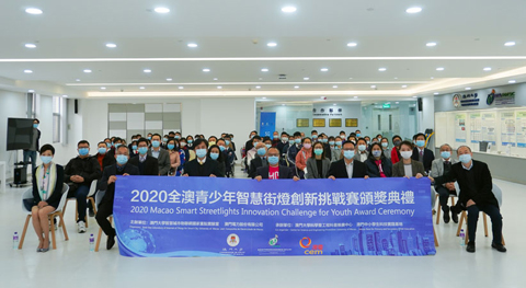 「二0二0全澳青少年智慧街燈創新挑戰賽」頒獎典禮於一昨日上午在智慧城市物聯網國家重點實驗室五樓展廳順利舉行,由中央人民政府駐澳門特別行政區聯絡辦公室經濟部處長楊皓、教育暨青年局教育研究暨資源廳廳長黃健武、環境保護局能源業發展及管理廳高級技術員李鑄新、澳門科學技術發展基金活動輔助部高級經理謝偉明、澳門大學校長暨智慧城市物聯網國家重點實驗室主任宋永華及澳電執行委員會主席梁華權等嘉賓向得獎同學頒發獲獎證書。通過是次挑戰賽,將更好落實特區政府的「數字澳門」建設方案,加快佈局建設數字基礎設施。◇
