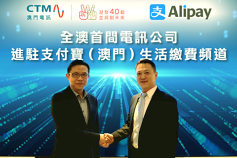 昨日,澳門電訊市務總監余少雄與螞蟻銀行(澳門)業務拓展部總經理繆澄宇,共同宣佈推出「澳門電訊x支付寶」便捷繳費服務,由即日起,澳門電訊用戶可透過「CTM Buddy」手機應用程式,或支付寶(澳門)小程序等方式,以澳門幣支付流動電話費、固網電話費、光纖寬頻費及預付卡增值,足不出戶享受零手續費、極快到賬的便捷繳付新體驗。