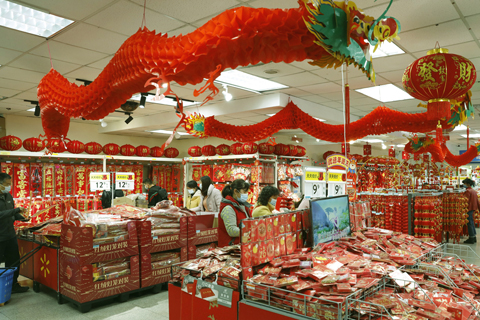 ◎ 二月八日,臨近春節,昆明市民在超市採購年貨,迎接即將到來的農曆新年。(中新社)