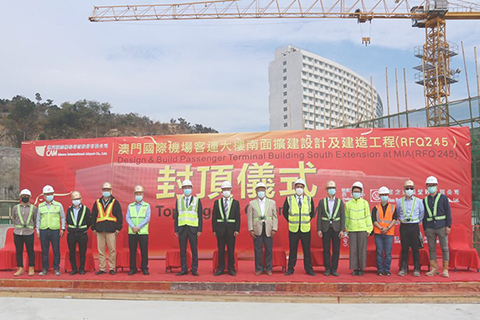 【特訊】澳門國際機場候機樓南面擴建的主體結構工程完工,並於本月八日舉行封頂儀式,整體項目預計於二0二一年第四季完成。澳門國際機場專營股份有限公司(CAM)基建發展部及機場營運部代表出席了封頂儀式,出席的單位還包括設計及建造承建商南方建築置業有限公司、工程監理單位PAL亞洲顧問有限公司及質檢單位澳門土木工程實驗室。