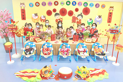 幼兒在導師的協助下,繪畫出色彩鮮麗的桃花樹,並一起擺放賀年全盒食品,懸掛賀年飾物,張貼恭賀揮春;導師藉此向幼兒講解春節的由來和故事,增加幼兒對節日及中國傳統文化的認識,幼兒們穿上色彩鮮艷奪目的中國傳統服飾,學習各種祝賀語句,互相祝賀拜年及品嚐各式各樣的賀年食品、糖果,敲打鑼鼓、舞動獅頭,接觸新年傳統風俗的事物,托兒所內洋溢著濃厚的節日氣氛,場面溫馨熱鬧,歡笑聲處處。
