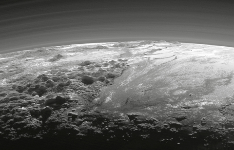 這片明暗相間的壯麗山脈和冰原聚成的原野,綿延向這顆遙遠行星的地平線伸展。影像攝於二零一五年七月十四日,時值新視野號通過最近點後的十五分鐘,回首眺望拍下這幅影像時,與冥王星的距離為一萬八千公里。這幅精彩、低角度的暮光景象,呈現了前景左側稱為諾蓋的崎嶇山脈、地平線附近的希拉里山脈、及右側平滑的史潑尼克平原。