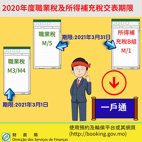 另根據第25/2021號經濟財政司司長批示,收益從多於一位僱主處獲取的職業稅第一組納稅人,以及不具備適當編製會計的職業稅第二組納稅人,2020年度職業稅M/5式收益申報書的遞交期限,將延長至2021年3月31日。