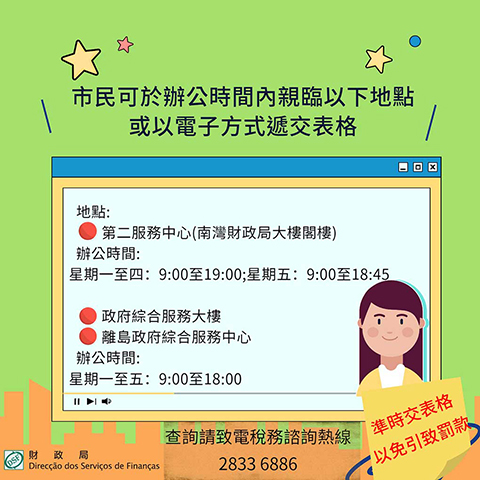 財政局呼籲納稅人準時遞交上述表格,以免引致罰款,市民可於辦公時間內親往以下地點,又或以電子方式遞交表格: