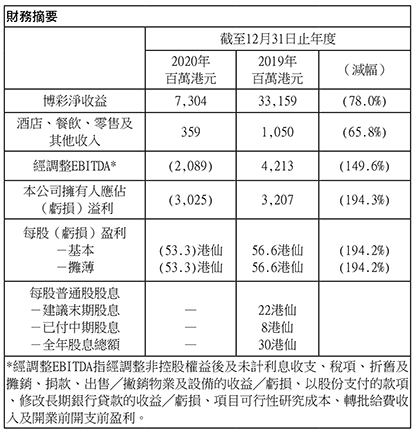 【特訊】澳門博彩控股有限公司昨(二十三)日公佈二0二0年全年業績。