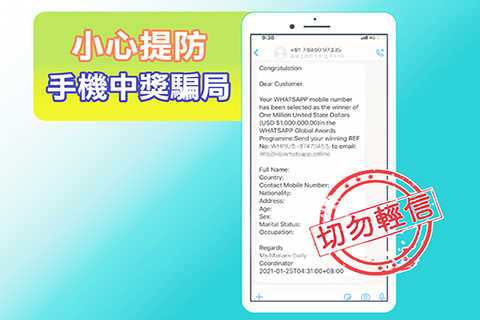【特訊】司法警察局消息:昨日,司法警察局再次接獲多名市民舉報,指其手機Whatsapp帳號收到一條來歷不明的英語訊息,內容稱其Whatsapp手機號碼在Whatsapp全球獎勵計劃中被選為一百萬美元的獲獎者,並要求該會員將獲獎編號連同姓名、國籍、聯絡電話、年齡、性別及住址等個人資料電郵至指定電子郵箱,以領取獎金。