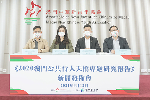 新青協昨日上午十一時舉行發佈會,公佈「二零二零澳門公共行人天橋專題研究報告」,新青協監事長陳偉斌、新青協秘書長張嘉敏、副理事長楊洪偉、交通政策關注組副召集人廖潤賢等介紹內容。