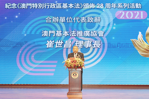崔世昌理事長在代表合辦機構致辭時表示,《憲法》與《澳門基本法》是推進澳門加快融入國家發展大局的法律保障,是「一國兩制」的基石。多年來合辦機構都結合紀念基本法頒佈周年的契機,結合形勢發展與社會現實需要,持續深入摸索宣傳推廣基本法的模式,取得了有目共睹的成績。他強調,宣傳推廣《憲法》和《澳門基本法》要圍繞國家當前新發展階段、新發展理念、新發展格局這三個「新」方位做工作,幫助廣大市民,特別是年輕人更好地認識祖國,在「粵港澳大灣區」的建設中尋求發展和進步,為保持澳門長期繁榮穩定,為維護國家安全做出貢獻。