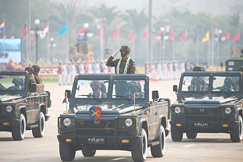 當天,緬甸在內比都舉行建軍節閱兵慶典儀式,紀念建軍七十六周年。緬甸國家管理委員會主席、國防軍總司令敏昂萊在儀式上致辭時提出國防軍將致力於在全國範圍內恢復和平。他再次承諾將重新舉行大選,並且會將國家權力移交給新的獲勝政黨。