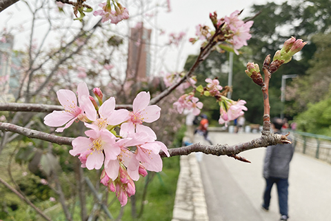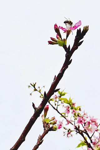 一個拐彎,眼前成排的櫻花樹上盛開著嬌嫩緋紅的花兒,淡淡的花香吸引了蜜蜂圍著花叢飛舞;只見蜜蜂從這朵花兒飛到那朵花兒、一刻也不曾停下,難怪大家都喜歡以蜜蜂形容勤勞的人。燦爛的櫻花讓大家忍不住駐足欣賞、拍照。廣州櫻的花期很短,每朵花從開放到凋謝只有7天,而整株廣州櫻的花期約15天;暗自幸慶能遇上。